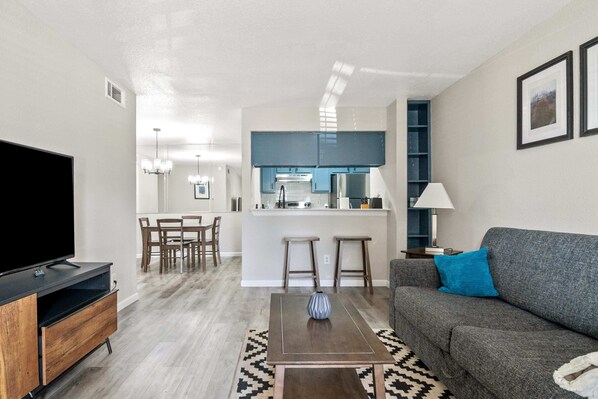 Living Area: Unwind on the cozy sofa that also converts to another bed, while enjoying your favorite shows on the flat-screen TV.