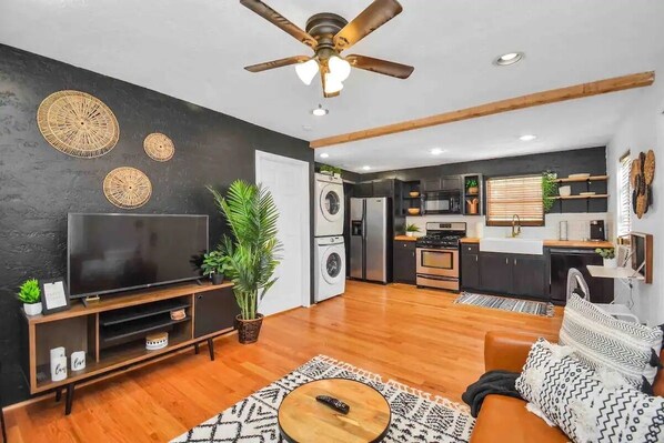 This stand alone quaint and cozy space is like no other you've ever seen. Walk up the stairs to your very own private entrance to enjoy the breathtaking comforts of this recently updated, stylish, spacious, beautiful, boho themed guest house. You will marvel in the open design concept of the kitchen and living room area with a full sized washer and dryer. Follow the boho theme to your cozy bedroom and master bathroom nestled right off the living room. This is your private space to relax and unwind.