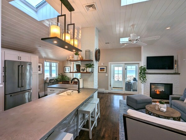 Experience beach living at its finest with this stunning beachfront 2-bedroom, 1.5-bathroom house with breathtaking ocean views. Completely remodeled in 2020 with high-end finishes, this serene, stylish space is the perfect place to unwind and relax. The open floor plan features a spacious living room, dining area, and a fully equipped kitchen with bar seating for four, making it perfect for entertaining. Enjoy the salt air and ocean breeze while dining al fresco from the large deck, complete with a built-in grill and cocktail station. The deck features Restoration Hardware outdoor sofas and chairs, as well as a Telescope outdoor dining table for six. The two bedrooms offer ample space, with the primary bedroom featuring an en-suite bathroom complete with a walk-in shower. Summer beach living at its best!