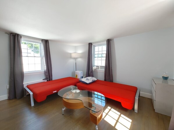 -- 2 bedrooms, 2 full bathrooms, living room converting into a spare bedroom. 4 beds, 3 sofas/futons convertible to twin, and full-size beds.