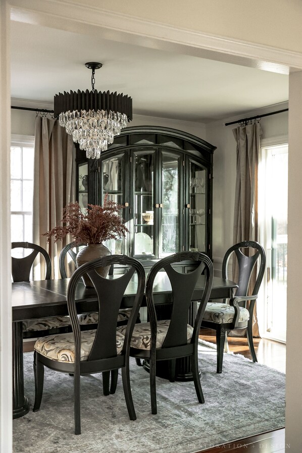 You'll enter the home into your formal living room with 65" Smart TV, custom velvet sofa, and 2 cozy chairs. Walk a few steps to the beautiful dining room with a crystal chandelier and seating for 6! The kitchen is fully stocked with everything you need to cook to your hearts content!