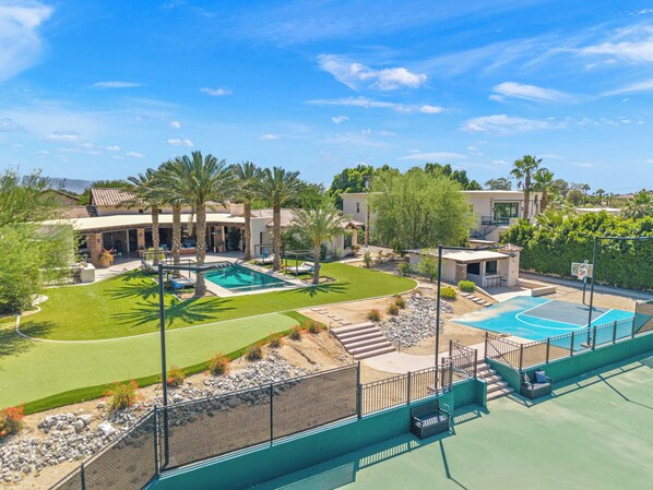 Immerse yourself in ultimate leisure by the shimmering waters of your private pool, where relaxation takes on a new dimension. For those seeking active recreation, a tennis court awaits your competitive spirit, while a basketball court invites friendly matches under the warm California sun. Challenge your companions to a round of putting on the immaculate green or gather around the firepit for intimate conversations under the starlit sky.