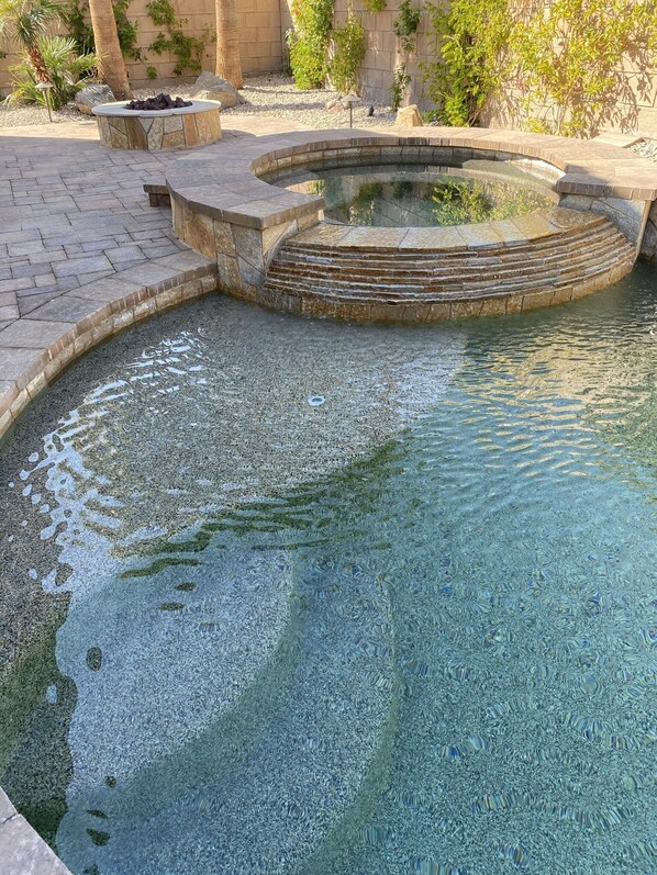 Covered patio with dining table and chairs, BBQ, and firepit. Also, lounge chairs and saltwater pool and spa. We also have a 42" smart TV in the backyard.