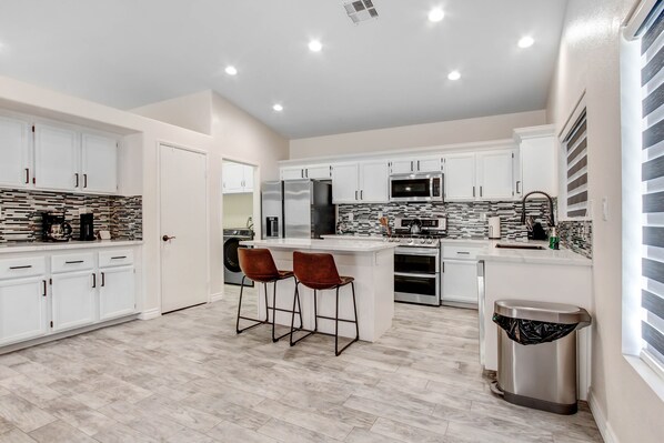 Welcome to your dream vacation home, a perfect blend of comfort and style. This spacious property boasts an expansive open floor plan encompassing 4 bedrooms, 3 full bathrooms, and a generously sized living area. The kitchen has been recently updated with elegant quartz countertops, new stainless steel appliances, modern cabinet colors, ample pantry storage, and a central breakfast island.