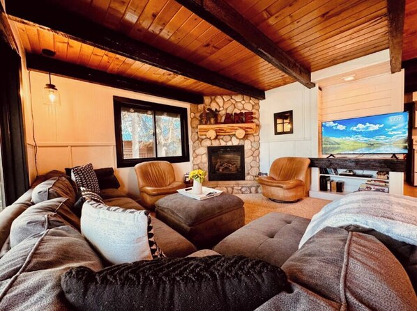 The main floor of this beautiful 2 bedroom 1 bathroom cabin features the first bedroom with a queen bed and a shared bathroom. This level also has a full-sized kitchen, large dining room table and a spacious family room with a fireplace, TV and plenty of room for gathering the whole family.