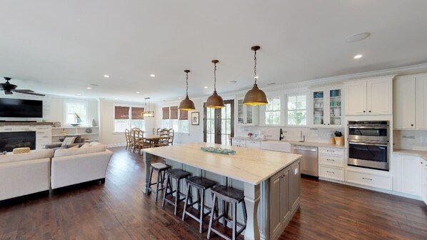 This is a beautiful well equipped house with plenty of room for our large multigenerational family group of 7 adults and 5 children. We had everything we could want in a vacation home - screened porches and balconies, backyard swimming pool and grill, comfortable furniture in living and bedroom areas, ensuite bathrooms for most of the bedrooms, and 2 block proximity to a beautiful beach. Highly recommend this house if you have a large group.