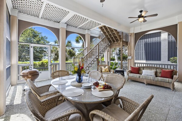 Godetevi le splendide viste sulla laguna da diverse stanze sul retro della casa, così come i nostri due portici schermati e la camera da letto principale. Questa laguna ha una scena della fauna selvatica tra cui un alligatore residente!
