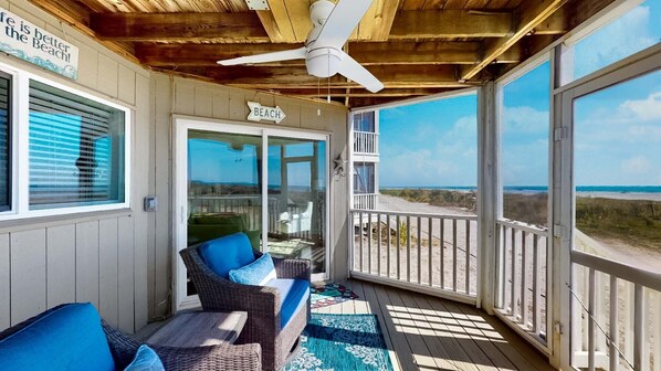 Bedroom 1: King bed, sitting/reading area, Smart Vizio TV , WiFi, sliding doors to screened in porch that walks directly onto the Beach