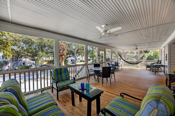 All'arrivo, si trova la scalinata principale della casa vi farà entrare dentro la grande veranda riparata. C'è un amaca per le vostre esigenze rilassarsi e molti posti a sedere per godersi la brezza dell'oceano, o gustare un pasto in famiglia. Una volta all'interno, si cammina nel concetto di pavimento aperto del soggiorno, cucina e sala da pranzo. Il soggiorno ha abbastanza posti a sedere per la famiglia per raccogliere intorno al televisore a schermo piatto. La grande cucina è completamente attrezzata e fornita di tazze, piatti e le esigenze di base per iniziare la vostra vacanza. La sala da pranzo 6 posti a sedere e ci sono 2 sgabelli da bar supplementari presso l'isola cucina per la vostra convenienza.