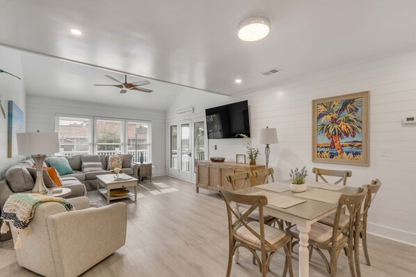 Journey into the home and you'll be greeted by an atmosphere of coastal elegance, with bright interiors and redone vinyl plank flooring. The living and kitchen area is open concept, and guests will find the kitchen is fully equipped, allowing you to make your own snacks and beverages in-between hanging out on the beach. The kitchen includes state-of-the-art appliances along with both a regular coffee maker and a Keurig for those who love their coffee right away! A four-seater breakfast bar makes for a great place to enjoy a quick meal, and a dining set seats six, plus two more with an added leaf.