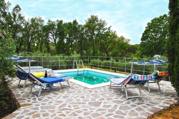Luogo affascinante di esclusiva privacy, la proprietà ad uso esclusivo permette di godere di 5000 mq di terreno, aree a prato e un magnifico uliveto; la presenza di recinzione e un grande cancello di accesso assicurano agli ospiti privacy per godere in pieno relax della vita all’ aria aperta. Piscina (mt 3.70x2.70x h. 1.50) aperta dal 01 maggio al 30 ottobre. Ideale per chi ama la tranquillità ed il silenzio immersi nella natura per un totale relax.
