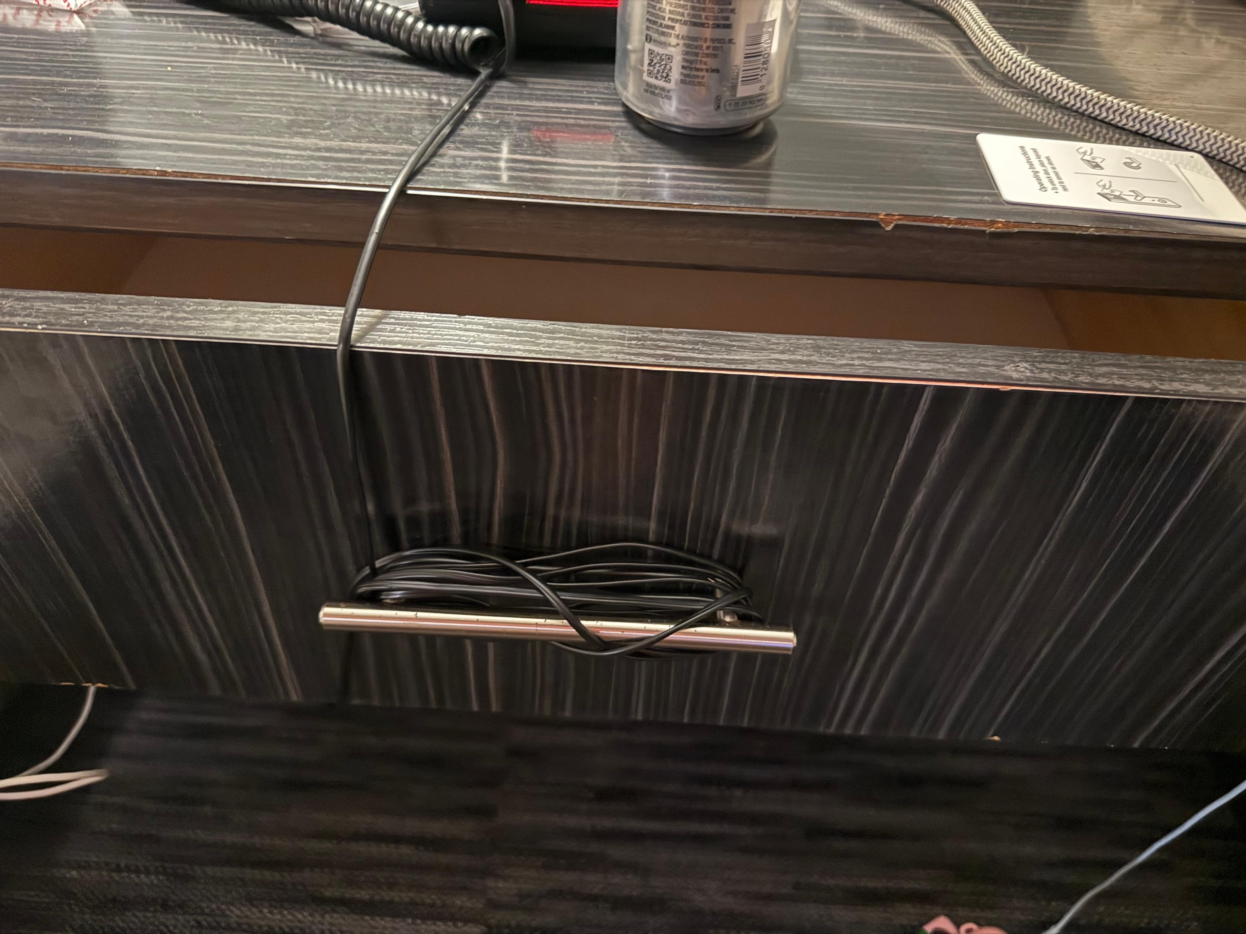 Someone had wrapped the telephone cord around the drawer handle to keep the drawer close.