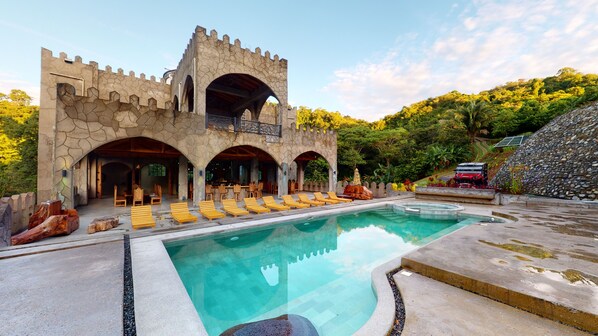 Protected by the Gargoyles and our onsite security/caretaker 24/7. We also provide airport transfers and COMPLIMENTARY SHUTTLE SERVICE TO JACO AND Hermosa Beach (NO RENTAL CAR NEEDED)! WE ALSO PROVIDE COMPLIMENTARY COOK FOR BREAKFAST AND LUNCH (COST FOOD EXTRA)! Be prepared to be blissfully taken away and live an enchanting fairy tale experience where amazing views, outstanding facilities, service, and amenities are second to none. The Castle of Oz also is an amazing wedding venue to make for a fairytale wedding! Please inquire within!