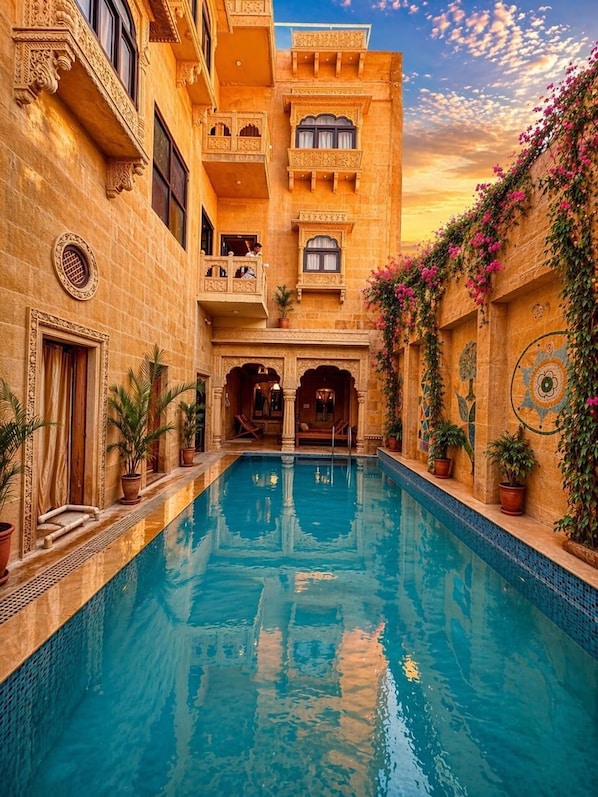 This hotel was incredible. The room was a comfortable size, beautifully decorated. The bed and pillows were so comfy. They decorated it in rose petals and balloons for my birthday as a driving surprise ( after my partner asked them) The outside of the building was so intricately decorated in carved sandstone. The pool was refreshing and a most welcome pleasure. Views of the huge fort looming above, while we are in the restaurant, were like something from a movie. The boys in the upstairs restaurant were so sweet and made absolutely delicious food. The concierge was very friendly and efficient and even gave us a ride back on his motor bike when he passed us walking back :)