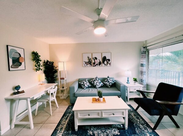 At Lowkl we strive to provide all of our guests with a clean, well-designed, and useful apartment in a great location at an affordable price. We tailor-make all of our units with your needs in mind. The apartment is located on the ground floor. It has a coastal design and feel to it. As you enter the sundrenched living room, you will find a comfortable Sofa bed that can be used to watch TV, read a good book, or sleep additional guests if needed. We have a comfortable reading chair, and a work desk in case you need to work remotely. We provide high-speed Wi-Fi and a large 50" HD television to watch your favorite streaming channels. There is a table for 4 to comfortably enjoy a meal.