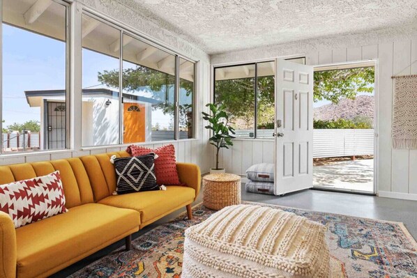 Inside the home, there’s an open-plan living space with two separate living rooms. Two bright bedrooms, with brand-new king size memory foam mattresses. There is also a futon in the sunroom that can be used for additional sleeping as an option (most comfortable for small kids).