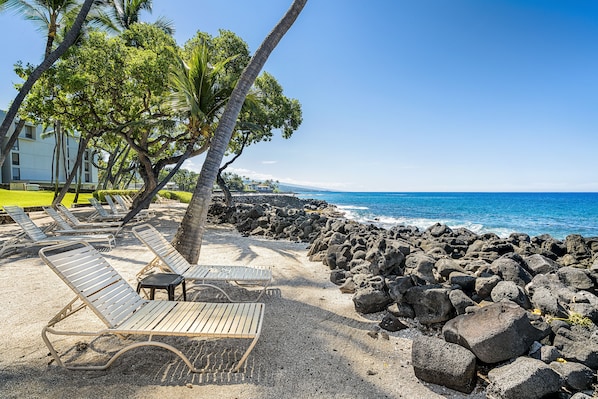 Updated kitchen and bathroom! D2 at the Kona Isle is a beautiful DIRECT OCEANFRONT property on the 1st floor of building D! No stairs! Cook in the full kitchen or on the grill! Enjoy dinner with a sunset view from your living room, lanai, or picnic tables! Feel the ocean breezes come into your living room in this gorgeous 1 bedroom, 1 bath condo and sleep to the sound of waves! The sofa does pull out to a bed, so a great option for 4! The living room has a split AC unit. The AC is ONLY in the living room. This amenity is FREE! The owner supplies beach chairs, towels, high-speed Wi-Fi Access for your convenience. Free HBO-max! This unit is in high demand! Truly a gem! Look no further, you've found the perfect vacation rental property for your next Hawaiian adventure!