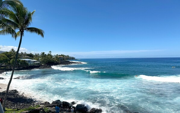 Parole chiave: Kailua-Kona, Kona Reef, condominio Oceanfront, condominio sul lungomare, vista spettacolare sull'oceano, spiaggia di Honl, terzo piano, letto matrimoniale, passeggiata in città, lanai privato, spiaggia