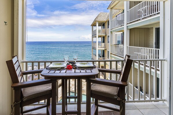 True and Absolute oceanfront condo with a lanai (balcony) that almost hangs over the ocean. View the tide pools below where turtles and eels like to come to eat. Let the sounds of the sea lull you to sleep after your day of sightseeing or relaxing; both bedroom and living room face the sea.