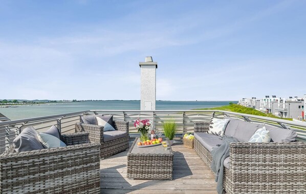 Il nostro posto preferito: la grande terrazza sul tetto con mobili da salotto, che offre una vista a 360° sull'ampio Schlei e sul porto per barche a vela e sportive della località sul Mar Baltico.
