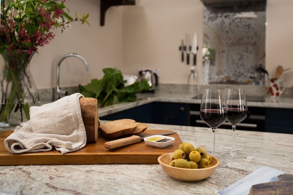 Beside a framed, first-edition Ordnance Survey map of the area, stairs ascend to an open-plan living space whose many windows and elevated position ensure much light. One corner contains the kitchen, where speckled white-granite counters top navy-coloured cabinetry and built-in Siemens appliances. Counter stools enable casual chats, while a dining table awaits opposite. Beyond that beckon two sofas. There's also a TV hidden inside a vibrant watercolour portraying the estate, and glorious views over rolling hills into England.
