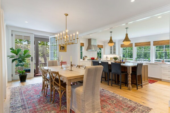 Favolosa cucina perline con bar per la colazione a blocchi di macelleria e sala da pranzo con posti a sedere per banchetti. Zona lavanderia e scrivania anche in cucina. Ponte attaccato fuori dalla cucina con tavolo e sedie per mangiare all'aperto e grill a gas per barbecue.