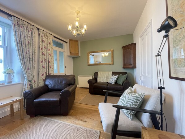To the front of the cottage is the lounge, which is full of character and comes with two seater leather sofa, chair, TV, and a lovely warming stove perfect for curling up on winter evenings. There is a selection of books and DVD's on the shelves for guests to enjoy.
