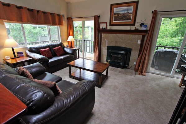 Il soggiorno ha un camino a gas, TV HD con lettore DVD e ponte. C'è un tavolo da bistrò sul ponte del piano principale e sedie Adirondack sul ponte al piano superiore - entrambi con vista su Baldy.