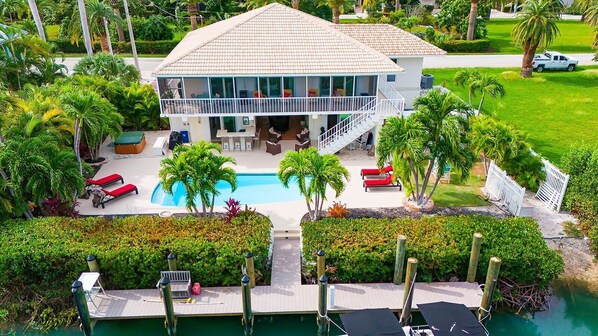 adventure. Featuring a sparkling heated pool, a private 50-foot dock, and an outdoor living