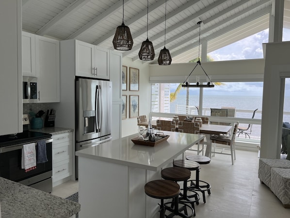 This villa has been renovated with high-end finishes and beautiful decorations. The inside of the villa is beautiful, AND its location within the Kawama Yacht Club makes this the perfect place for your Key Largo vacation. The floor to ceiling windows reveal an expansive water view that is breathtaking. We enjoyed gorgeous sunrises and amazing sunsets from the deck. The owners were kind and responsive. In fact, when the main TV stopped working, the owner drove to the villa (with a huge tray of Cuban pastries from nearby Pinecrest Bakery) and immediately made the repair. Everything about this villa is top-notch!