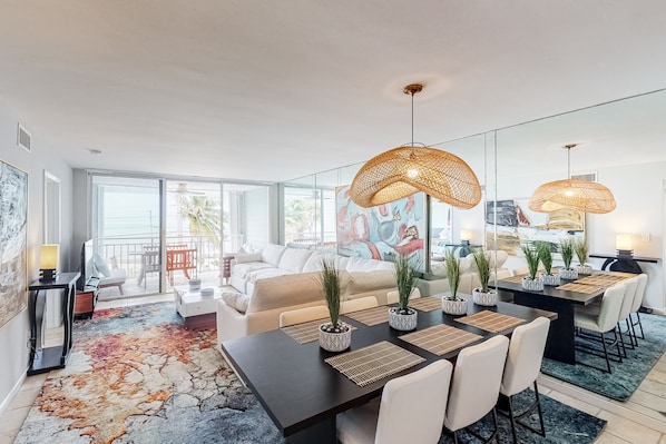 At the condo itself, start the day on your waterfront balcony, enjoying your coffee with a side of sea breeze. The double set of patio doors lets tons of natural light inside, which features plenty of space to spread out and lots of colorful art and area rugs. The well-equipped kitchen offers a full suite of stainless steel appliances, and there’s room for the whole group to eat together at the large dining room table. Head out to explore or work on your tan at the pool, returning home to relax in the central AC. Stream the latest show on the oversized sectional or use the free WiFi to upload the day’s pics to social media. Step out for dinner at a local restaurant or keep it simple on one of the complex’s shared grills. Call it a night in one of two comfortable bedrooms, but not before one last toast on your balcony to booking the perfect Key West escape.