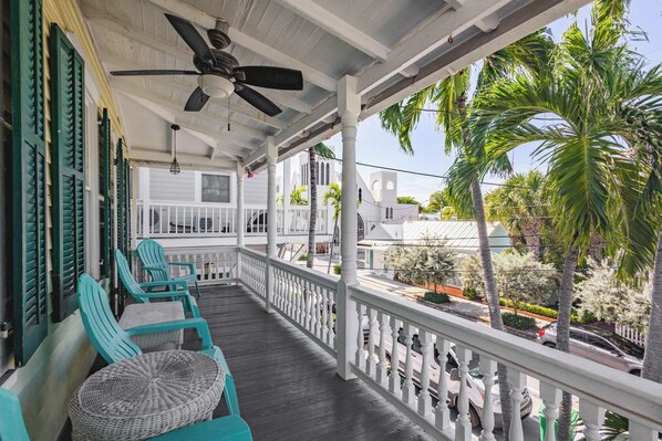 After a long day of travel not being able to even find a spot to unload the car didn't start the experience off on the right foot. The white gate which was black where it needed to be touched and the house was in need of serious maintenance and proper upgrades. The door was confusing as it had to be opened up. When you open the door the combination of musty and pot smell hits you instantly. Our rooms we were set up so that everyone had to come in and out of one bedroom and that in order for the ppl in the second bedroom to access that balcony or bathroom they had to also come through that bedroom. The shared balcony was hard to access, and leaning with peeling paint, and didn't feel safe. The pictured balcony over the pool isn't part of this set of rooms. The window AC unit was loud and inefficient, and one was crooked with a overflowing pan under it. No AC in the bathroom so the door had to be left open or it was unbearable as there was a gap under the outside door. The floor and ceiling showed signs of previous leaks. Cobwebs everywhere. The fan could only be adjusted by standing on the bed as only the second bedroom had a remote. It was the second day when we discovered the problem with the TV was that there was no cable remote. Our hope for the pool being cleaned was squashed when we discovered the filter not on and the pool was still full of leaves and the whole pool deck was not as pictured. We spent more to stay at this property with no parking for the pool and balcony