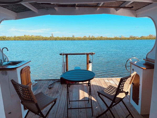The ideal getaway, I brought a grill and a pan and did all the cooking outside on the deck. Took paddle boards through mangrove tunnels and saw tons of fish. Had a baby sea turtle swim up to the boat.