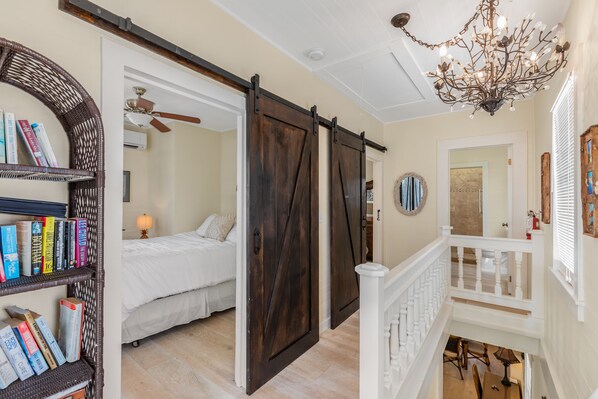 Follow the stairs up to two comfortable guest rooms lying beyond charming barn doors for your peaceful night's rest. The first room comes with a queen bed and a TV with direct access to the front balcony with a charming swing to overlook the vibrant neighborhood. The second room comes with a king bed and a TV , as well as access to a rear facing private sundeck with loungers for your lazy days. Full bathroom with shower is located on the second floor. An additional half bathroom lies outside off the back porch area.