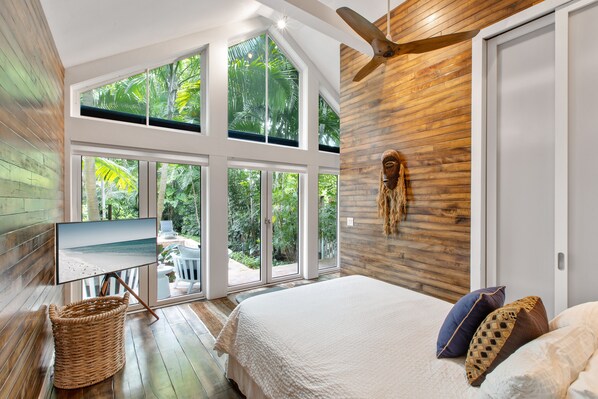 La splendida master suite si affaccia sulla piscina ed è dotata di un letto matrimoniale, TV a schermo piatto e un bagno completo con doccia a pioggia. La seconda camera è dotata di una grande scrivania con 2 monitor per chi lavora in remoto e di un letto estraibile (2 letti singoli XL). Apri le porte di questa stanza su un ponte privato con 2 posti a sedere, pesi liberi e una doccia esterna rinvigorente. Gli ospiti che occupano questa stanza possono utilizzare la vicina stanza di polvere fuori dalla zona giorno. Oltre la piscina si trova un cottage privato per gli ospiti che mostra i soffitti della cattedrale, due letti gemelli XL che si trasformano in un re, una TV a schermo piatto, un bagno con doccia e un comodo mini frigorifero e keurig per consentire tazze di caffè al mattino sotto il tendone del portico del cottage. Una lavatrice e asciugatrice si trovano proprio dall'altra parte del cottage.