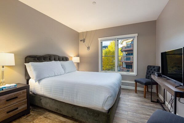 Condo is well appointed and stylish. Location great to gondola. Small with no storage, had to set suitcase open on two chairs for excess. TV in main area was horrible, picture so dim and sound impossible to understand. TV in bedroom has ok picture but was super cheap with horrible sound as well. I’m not a big TV watcher but after skiing all day, a soak and dinner I’m ready to veg. Wasn’t possible, so read? Lamp in living room was broken. Called management they sent maintenance person who confirmed the lamps were broke and the TVs awful, but nothing was done to correct the situation. This was just icing on the cake after arriving 2.5 hours early and having to sit in the parking lot and wait till 4:30 check in or pay extra per hour….just didn’t sit well with me. Greed rather than consideration of the customer. Not the best experience thankfully, the weather, skiing and company were great.