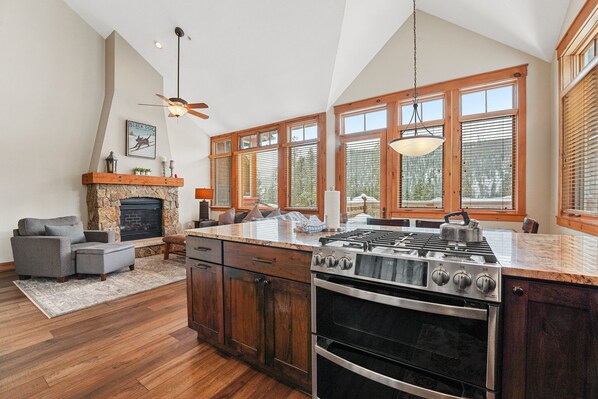 L'ampio ingresso offre tre set di ganci montati, una panca e cubbies di stoccaggio per la vostra convenienza mentre andate e venite per tutto il giorno. Al piano superiore è il livello principale della residenza. La zona giorno dispone di ampie finestre per l'abbondanza di luce naturale, una grande TV a schermo piatto e un bel camino a gas. Il divano può essere trasformato in un letto queen-size, e ci sono lenzuola e coperte extra in un armadio. Appena fuori dalla zona giorno si accede al ponte privato. C'è una bella vista, posti a sedere supplementari e un grill a gas.