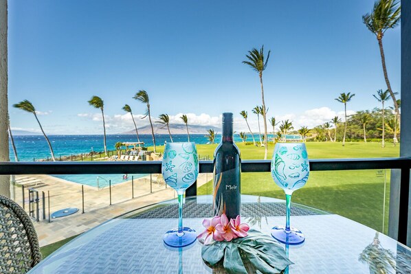 Il lanai privato ha un tavolo da bistrò con due sedie da bistrot reclinabili - un luogo perfetto per gustare il caffè del mattino o una cena romantica sull'oceano! Tartarughe e delfini possono essere visti tutto l'anno, balene di stagione.