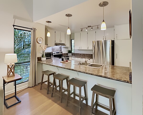 Questa unità moderna e aggiornata con vista sul giardino è dotata di un proprio lanai privato con lussureggiante vegetazione tropicale proprio all'esterno che aggiunge la tranquillità di questo gioiello nascosto al piano terra.