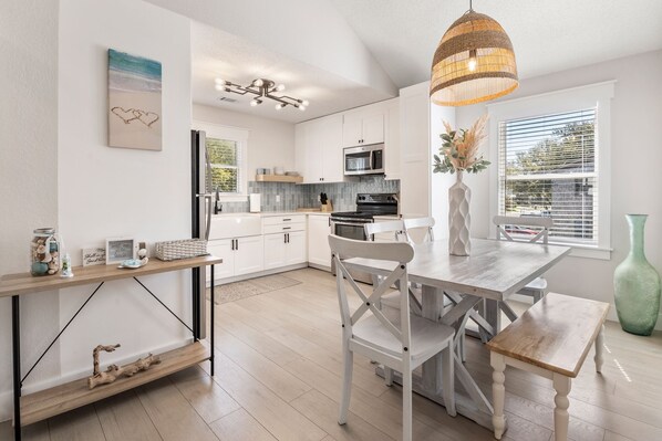 Heaven At The Sound is a charming beach house centrally located at Milepost 6 in Kill Devil Hills. As the name implies, this immaculate home is situated just three lots back from the Kitty Hawk Bay and is just a short walk to the community sound access. Completely renovated and newly furnished, Heaven At The Sound features stylish, coastal-inspired updates throughout. After a day of fun in the sun, come home and relax in the open-concept great room where you can curl up on the comfy sectional to watch TV or read a book. Vaulted ceilings, abundant natural light and crisp white walls transform this cozy cottage into a bright and airy retreat. Wide-plank LVP flooring flows throughout the common areas for a cohesive look and easy clean-up, ideal for families with kids and dogs. The chef in the group will appreciate the remodeled kitchen that boasts stainless steel appliances and thoughtful design choices, including a farmhouse sink and open shelving. The primary bedroom features a king bed and an updated ensuite bath for plenty of privacy. Two additional bedrooms and a full hall bath can easily accommodate family and friends. Outside, the front porch is the perfect place to start your day with a cup of coffee. The yard is surrounded by mature vegetation and includes a hammock for afternoon naps under the trees.