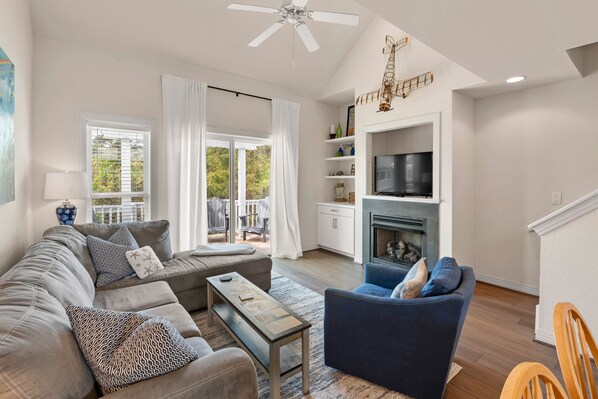 On a quest to find the perfect combination of amenities and affordability? Then Bermuda Bay is your oyster and this OBX townhome is your pearl! Purple Pearl features four separate levels that can easily accommodate family and friends. You'll find updated finishes throughout, including LVP flooring and gorgeous ceramic tile in the remodeled bathrooms. The chef in your group will appreciate the fully renovated kitchen with stainless steel appliances, quartz countertops and a coastal-inspired shiplap accent wall. After a day at the beach or by the pool, come home and relax in the comfortably furnished great room featuring vaulted and 9' ceilings for a bright and airy atmosphere. The open-concept layout provides sightlines from front to back and encourages quality time spent together. A slider lets in an abundance of natural light and leads to a spacious deck with pergola for outdoor lounging. The mid-level consists of two bedrooms, one of which has access to a covered deck. Both bedrooms include ensuite baths for plenty of privacy. For additional sleeping arrangement options, the loft is furnished with a king bed and bunkbed set. Downstairs, the rec room provides another space for gathering. It's furnished with a mini foosball table and leads out to a covered patio with grill.