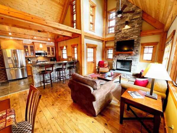 The main floor boasts an expansive open-plan living room and kitchen with high ceilings and a stunning stone fireplace. A second comfortable living area with a fireplace is located on the basement level. Both spaces feature large Smart TVs with basic cable, allowing you to stream from your favorite accounts.