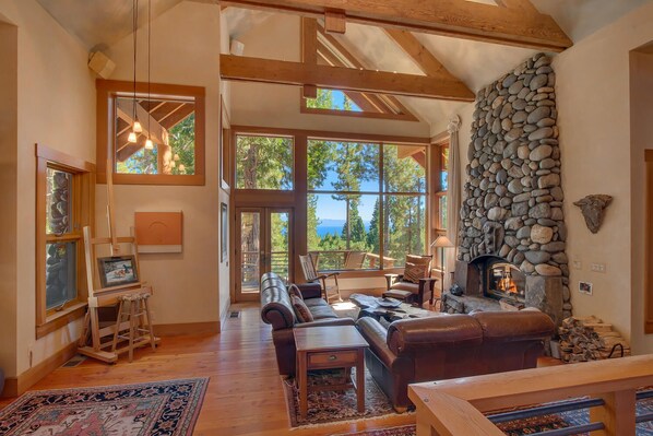 This custom vacation home was built as a Tahoe Lodge style artists’ retreat. Well above Kings Beach, yet only 1.5 miles from the lake, this North Shore lakeview vacation rental feels like a world away without sacrificing all the access you need to enjoy all the area has to offer. Surrounded by national forest on three sides and offering views of Lake Tahoe from almost every room, your Tahoe vacation in Manzanita House will certainly be an escape from the everyday. You can hike, mountain bike, cross-country ski and sled right out the back door. Set back from the street in natural landscape, there is plenty of privacy and off-street, overflow parking. Appointed with extensive stone masonry, antique doors, wood plank flooring, tribal carpets, leather furniture, Venetian plaster and artistic touches, this home is truly a unique alpine getaway. Four full baths, a large, private primary suite with fabulous views, and a gourmet kitchen place this vacation rental home above the rest. Located only 12 minutes from Northstar California Ski Resort, five minutes from local restaurants and sandy beaches, and five miles to gaming at Stateline, there is something for everyone staying at Manzanita House.