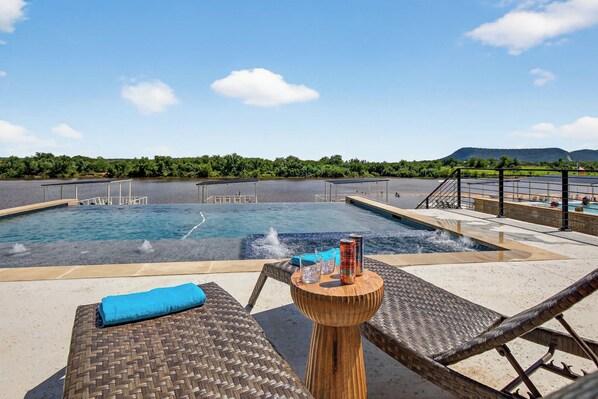 Infinity Edge Swimming Pool with Optional Heating (Heating Fees Apply) | Swimming Pool Dimensions: 25' Wide, 20' Long, 4' Deep | Tanning Ledge | 6 person Spill-Over Hot Tub | Hot Tub Dimensions: 8' Long by 5' Wide