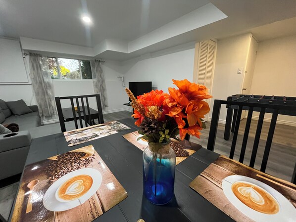 Our week long stay was mixed. Overall, the unit is as advertised, as we were not surprised with anything inside the unit. Our stay, unfortunately, was soured by the activity of the people upstairs. Understandably, as this is a basement unit, we expected noise from upstairs, however, the constant door slamming, rough housing, yelling, and music coming from upstairs made for an unwelcoming environment. The noise was constant, each night, past midnight, sometimes reaching 1am. It appeared to be at least four, maybe six people coming and going all day and night. Twice, the noise, banging, and stomping was so aggressive it knocked out the vent register from the ceiling. Additionally, the upstairs would begin cooking meals seemingly at 11:30pm reliably, which would make its way downstairs through the air vents which would fill the unit.
