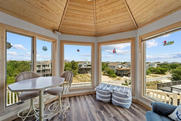 King MBR, Living Area, Kitchen, Dining Area, Tower Room with Ocean View, Half Bath.
