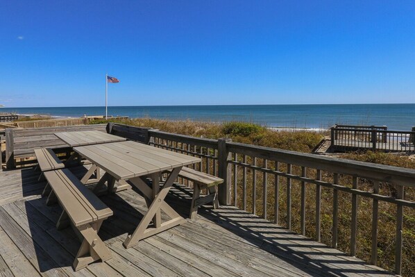 Dry entry into the lower level of the home; separate area with additional refrigerator and elevator access (elevator takes you to the living area and to the top floor King bedroom); enclosed outdoor shower; access to the oceanfront dune deck with foot wash and open shower.