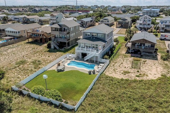 “Drift" away in this adorable cottage by the sea! Beautifully decorated with high quality and charming furnishings, this is an idyllic location for your beach vacation. And don't worry about leaving anyone behind, because Drift is dog-friendly! The outdoor area is amazing with a beautiful private pool and hot tub, covered patio, sounds of the ocean waves, a maintained lawn, bench swing, and gas grill. The lower-level outdoor living area is perfect for all-weather use and includes a sectional with seating for 10, a 60" Smart TV with cable, wet bar with seating, mini-fridge, and dining table for 6. The fully updated cabana bath includes ceramic tile flooring, custom tile and vanity, and a glass shower with dual showerheads. The pool area has ample seating, a dining table for 6, and an expansive yard for games and fun. You will spend all your time there when you are not at the beach.
