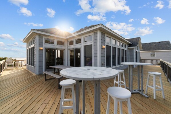 Upstairs, you'll be welcomed by an open living area. Complete with plenty of seating and a large flat-screen TV, it's the perfect place to unwind and relax with family and friends. Enjoy beautiful views of the Currituck Sound from the dining area and from the furnished sun deck. During your stay, you'll be able to prepare meals easily in the spacious kitchen. With a gas stove, dishwasher, and ample counter space, you'll be able to whip up everything from snacks to full-course meals. The dining room table seats 10, and the breakfast bar features seating for 4. When it's time for bed, head to one of the 6 bedrooms, 2 of which are master. This home also features an enclosed outdoor shower, a gas grill, and a scenic bike path that leads straight into town. Whether you're cooking up a family feast, lounging in the sun, or exploring the best of Duck, Dabbling Duck offers the ultimate Outer Banks vacation experience.