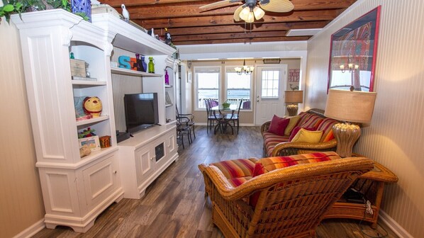 Pirate Queen offre una vista spettacolare sull'oceano e si trova al Mile Post 4 1/2. Ben arredato e ben attrezzato, questo accogliente cottage si trova proprio sulla spiaggia, basta scendere le scale dal ponte privato sull'oceano e ci sei, dita dei piedi nella sabbia! Questa casa sulla spiaggia è stata presentata su HGTV Beachfront Bargain Hunt. Gli aggiornamenti per il 2020 includeranno nuove sedie da cucina e alcuni dipinti.